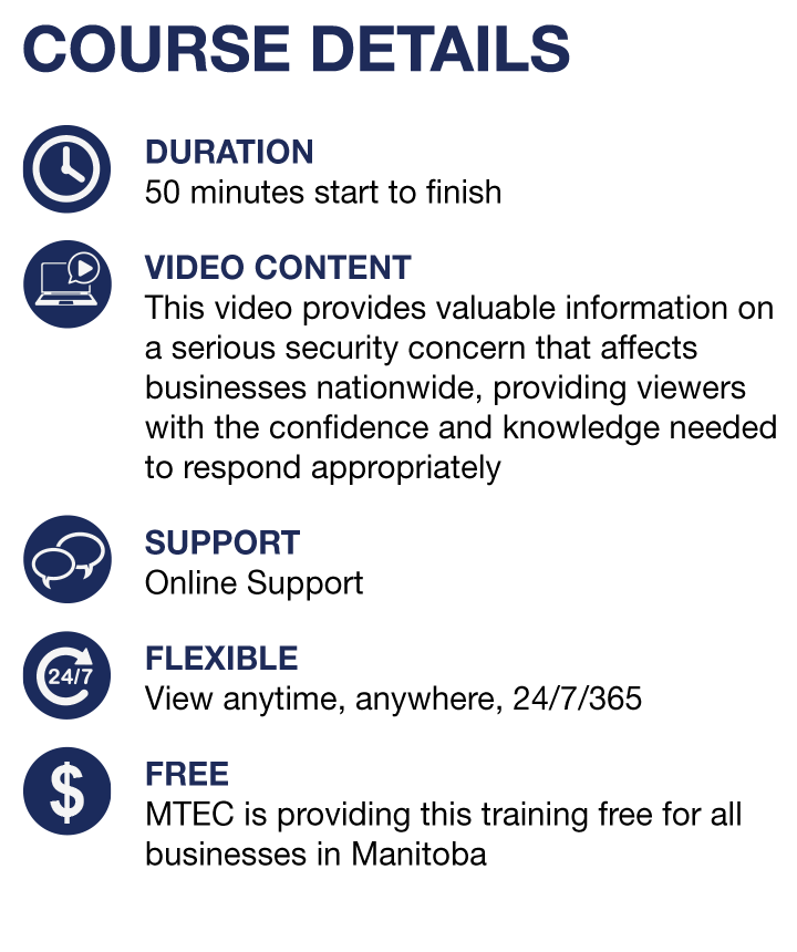All accounts are reviewed by an MTEC Coordinator. Although this training video was created for the Hospitality and Tourism industry in Manitoba, because of the current crime situation impacting all businesses in the province, MTEC is providing all of this training free for all businesses in Manitoba.